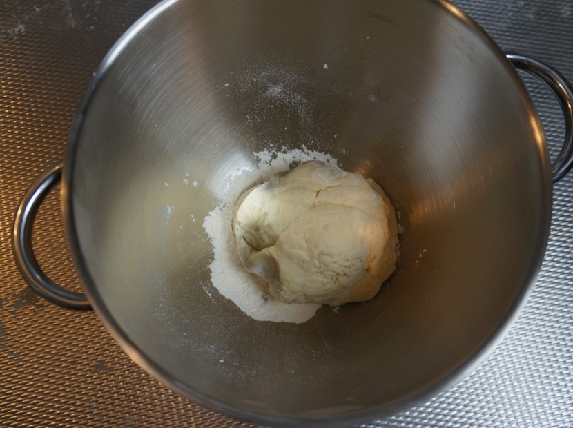 Kneed het deeg minstens 5 minuten goed door, draai er een bal van en leg in een diepe kom.